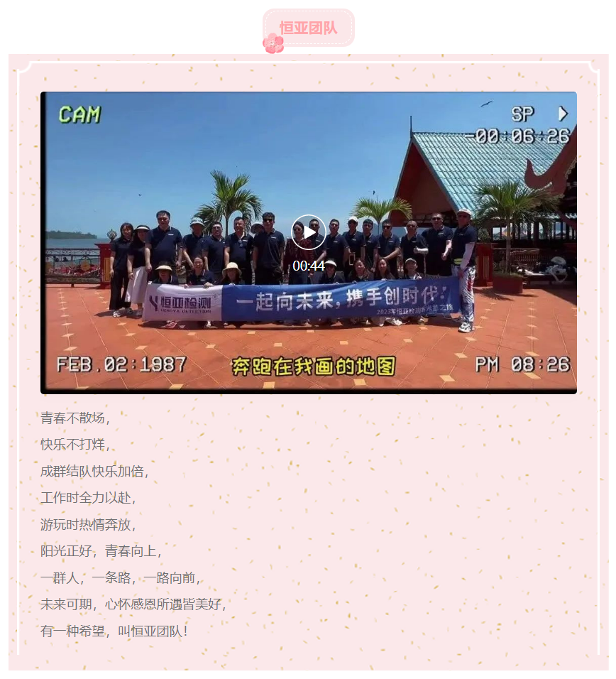 青春不散場, 快樂不打烊, 成群結(jié)隊快樂加倍, 工作時全力以赴, 游玩時熱情奔放, 陽光正好,青春向上, 一群人,一條路,一路向前, 未來可期,心懷感恩所遇皆美好, 有一種希望,叫恒亞團隊!